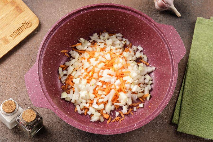 Для приготовления возьмите казан или глубокую сковороду с толстым дном. Налейте масло, разогрейте его и выложите нарезанный кубиками лук и тёртую морковь.