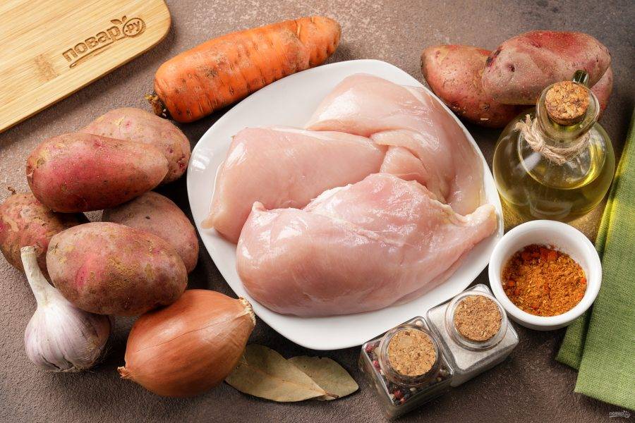 Подготовьте все ингредиенты по списку. Я буду готовить с грудкой, но вы можете взять любые части курицы на кости. Перед приготовлением порубите курицу на части, промойте и обсушите. Количество картофеля берите на своё усмотрение.