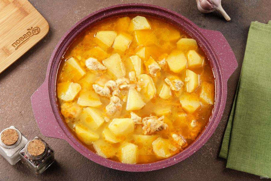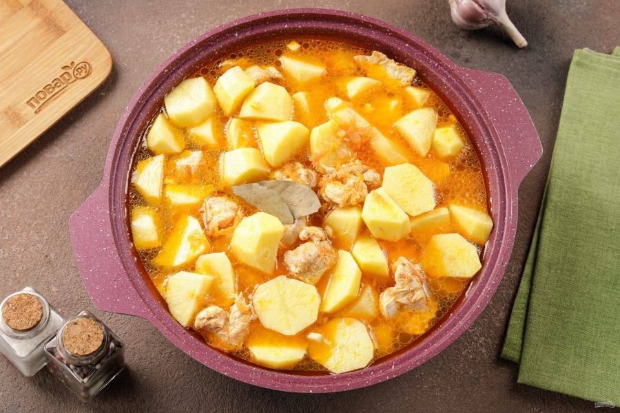 Накройте крышкой, доведите до кипения, затем сделайте огонь минимальным и тушите около 20 минут (до готовности картофеля).