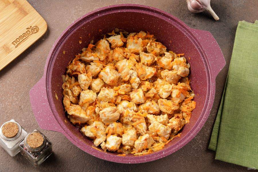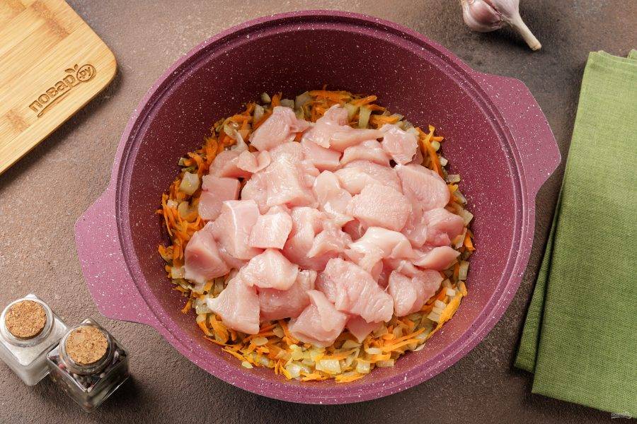 Обжарьте овощи до мягкости и добавьте нарезанную кусочками грудку.
