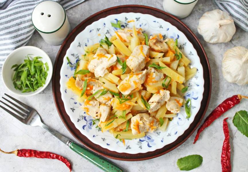 Картофель порежьте соломкой и выложите к овощам с курицей.