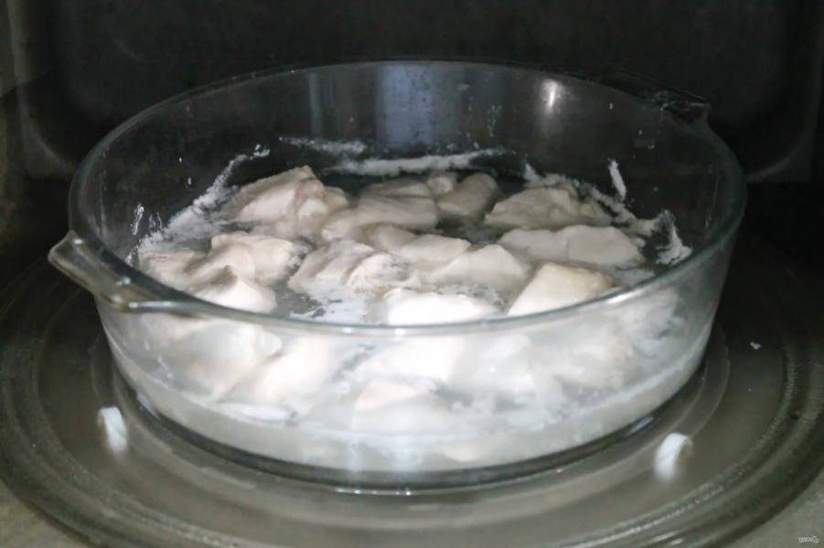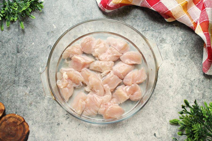 Куриное филе сполосните и обсушите. Порежьте курицу на кусочки и выложите в миску, которая подходит для приготовления в микроволновке. Влейте к курице часть воды, чтобы она только покрыла мясо.