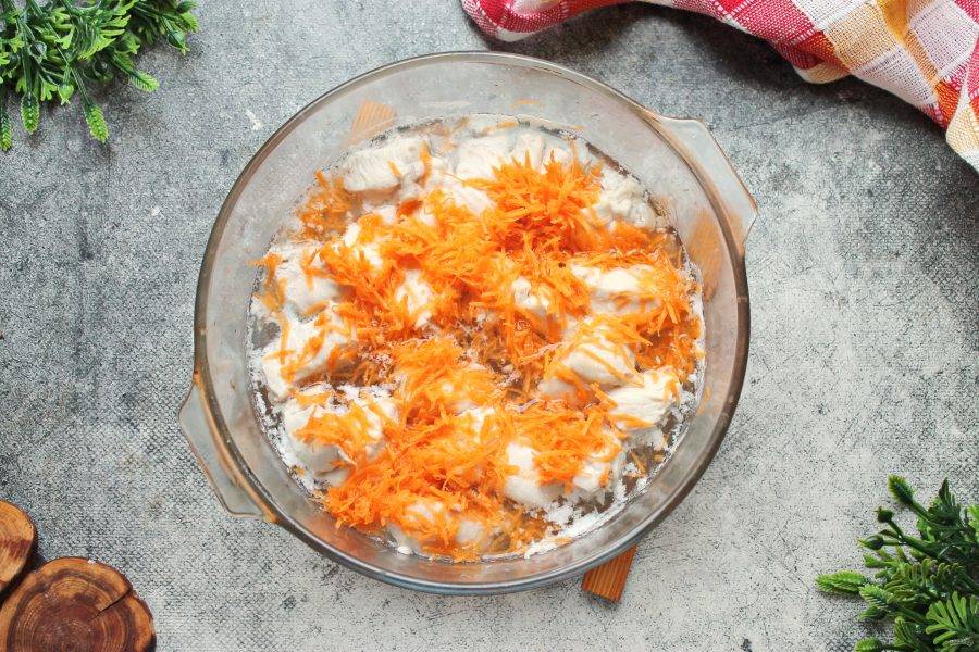 Морковь натрите на средней терке и выложите ее к курице.
