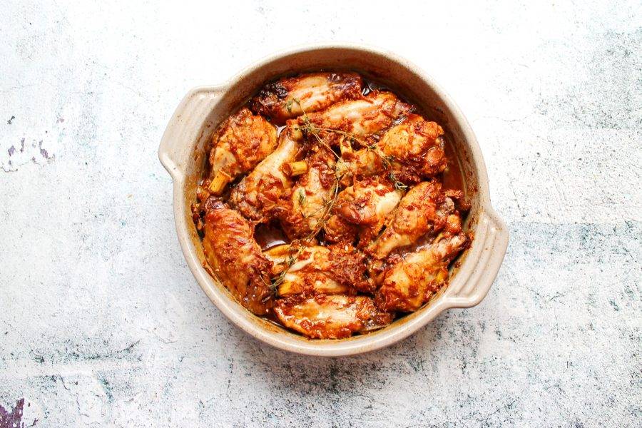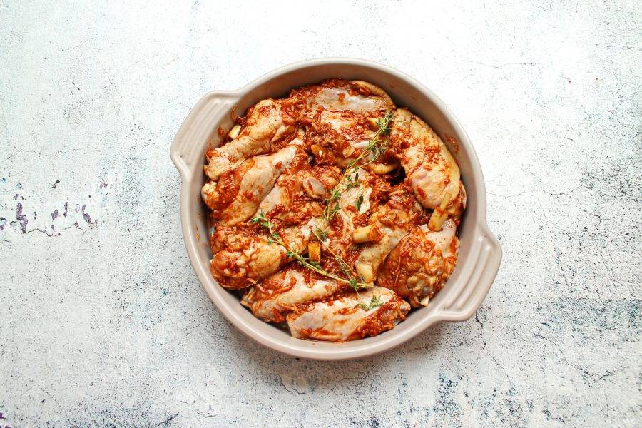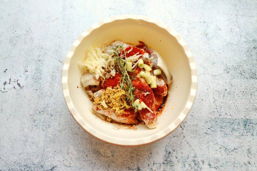 Курицу сполосните и обсушите, выложите в миску. Добавьте тертый имбирь, чеснок, паприку и кориандр.