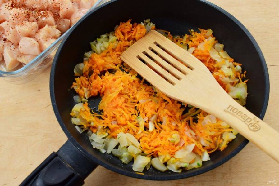 Морковь натрите на крупной терке, лук измельчите. Обжарьте на разогретом оливковом масле до мягкости.