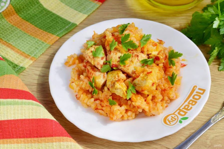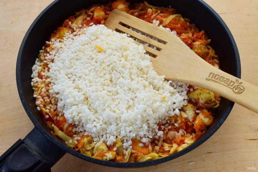 Добавьте промытый рис, залейте водой или бульоном (2 стак.). Доведите до кипения, накройте крышкой и тушите на медленном огне в течение 30 минут до готовности риса. Крышку не поднимайте, дайте рису хорошенько пропариться и стать рассыпчатым.