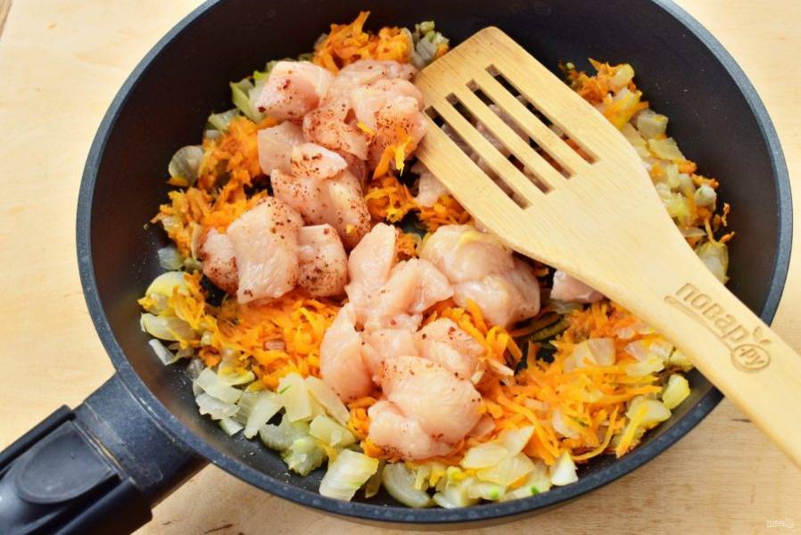 Куриное мясо нарежьте на кубики, обжарьте до румянца.