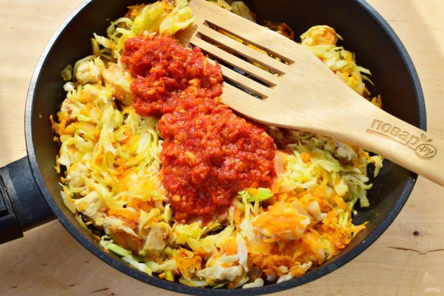 Добавьте мелко нашинкованную капусту, готовьте до мягкости. Соедините с томатным пюре из перетертых помидоров в собственном соку. Посолите и поперчите по вкусу, тушите в течение 2х минут.