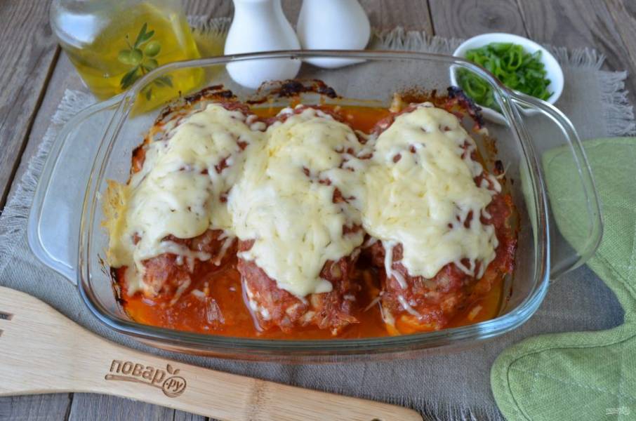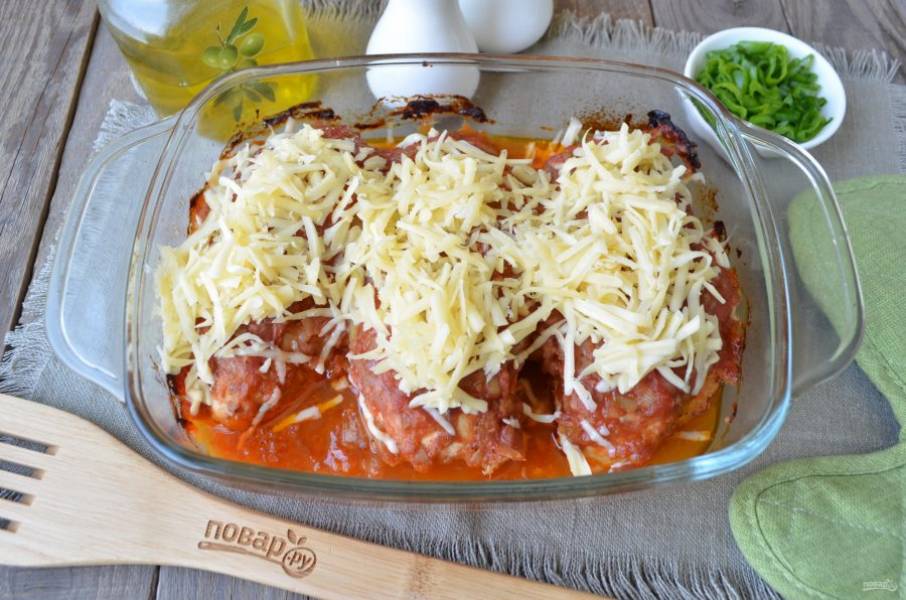 Посыпьте тертым сыром готовое мясо и верните его в духовку на пару минут, чтобы расплавился сыр.