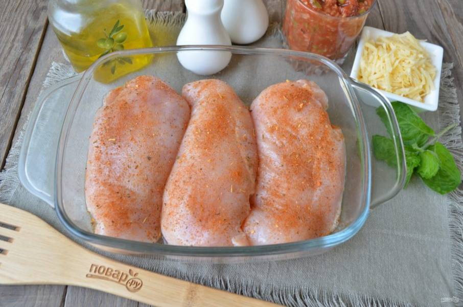Огнеупорную форму смажьте растительным маслом. Куриные филе посыпьте щедро приправой для курицы, если в ней нет соли или перца, добавьте их самостоятельно. Уложите куриные филе плотно друг к другу.