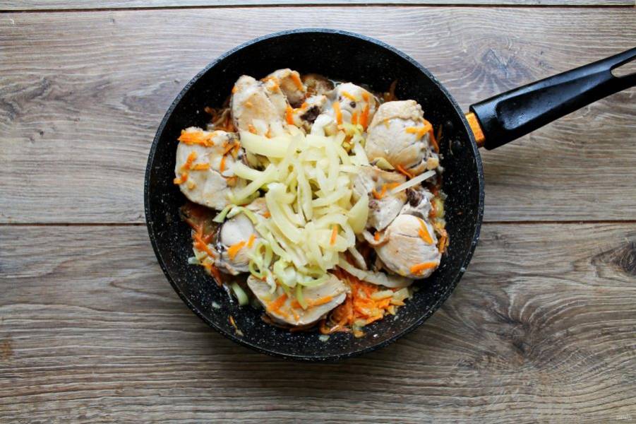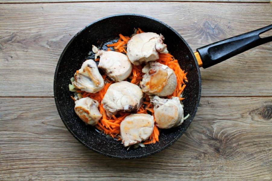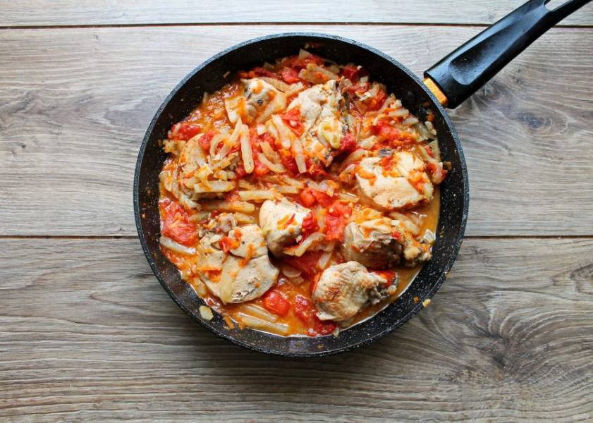 Добавьте в сковороду обжаренную курицу. Все перемешайте, закройте крышкой и тушите в течение 10 минут.