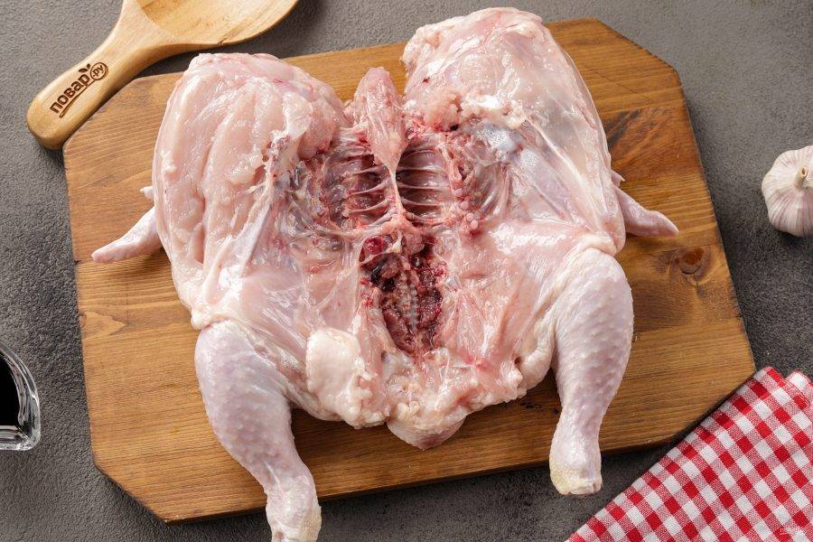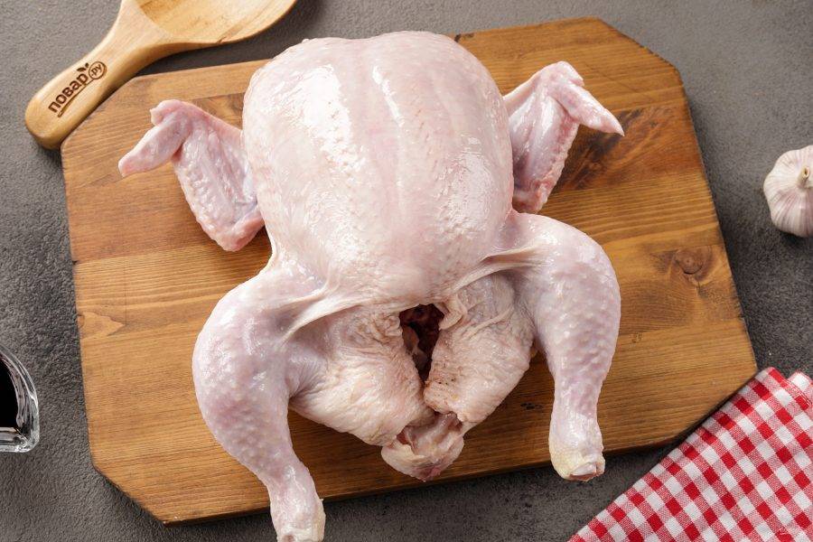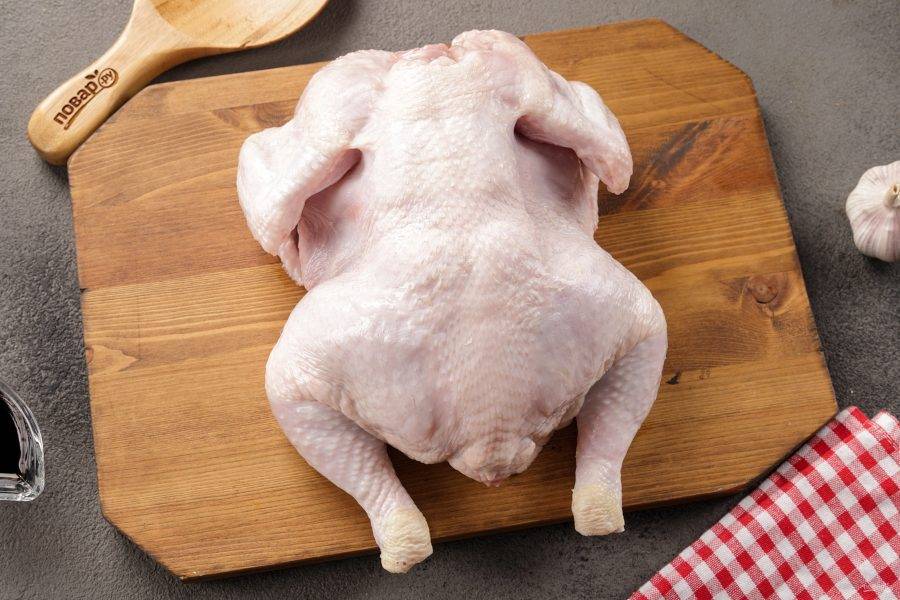 Курицу промойте под холодной проточной водой, удаляя остатки перьев. Срежьте все ненужное, если необходимо.