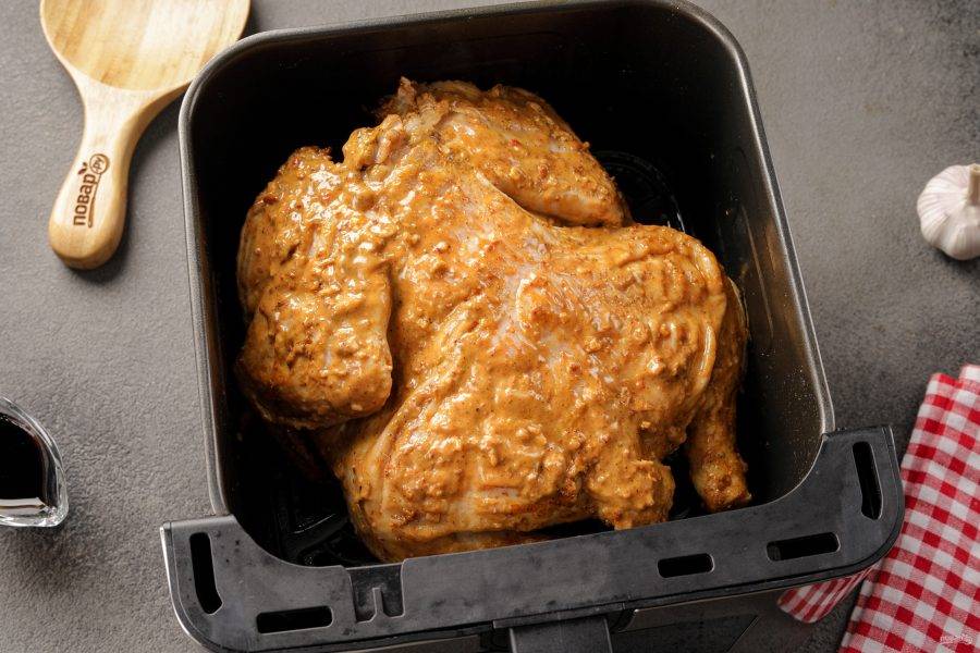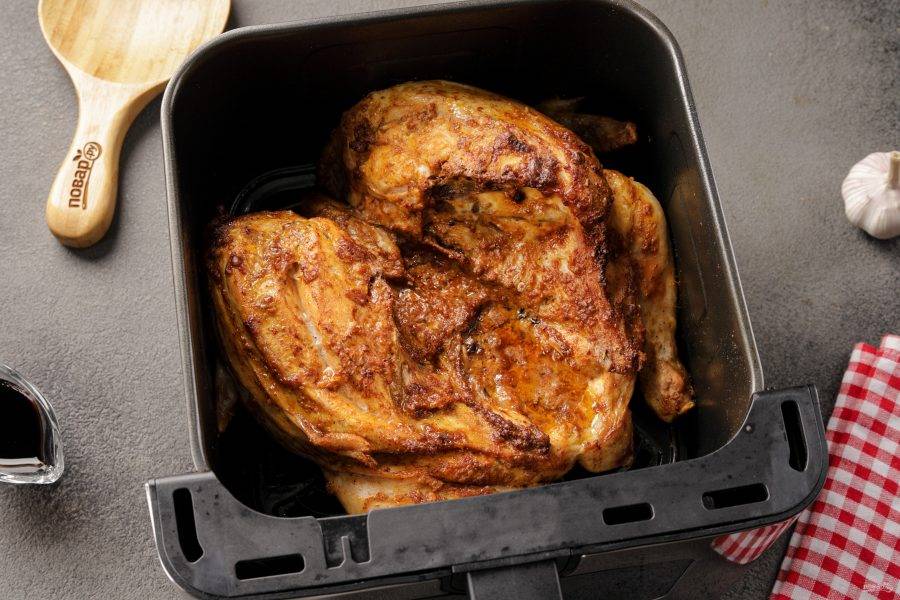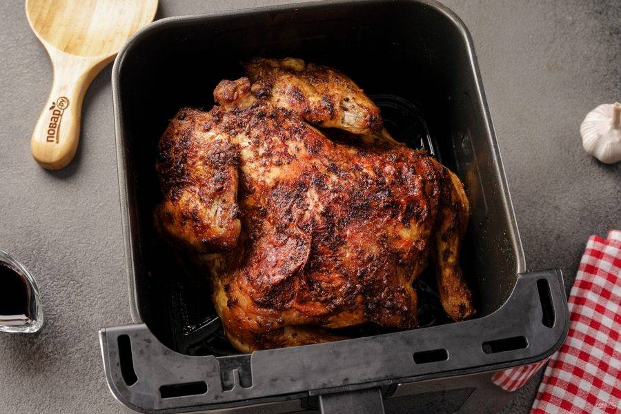 После окончания программы проверьте мясо на готовность, если необходимо, уменьшите температуру до 160 градусов и готовьте ещё 20-30 минут. В зависимости от мощности аэрогриля, размеров курицы и времени маринования, указанное время может меняться.