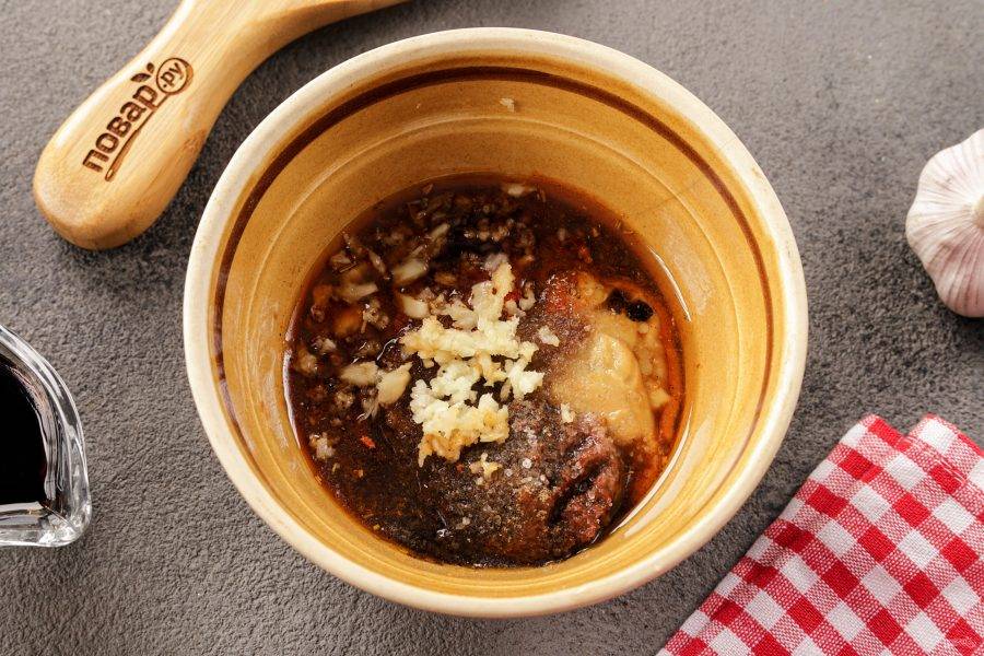 В глубокой тарелке соедините все ингредиенты для маринада: горчицу, аджику, майонез, соевый соус, растительное масло, давленный чеснок, соль и специи по вкусу. Перемешайте. Чеснока можно взять больше, чем написано в ингредиентах, можно же и вообще от него отказаться, если вы не любите.