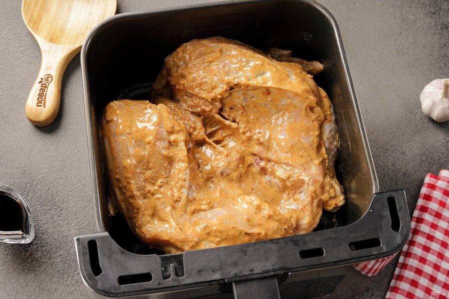 В чашу аэрогриля установите решетку и сбрызните ее маслом. Уложите курицу грудкой вверх. Установите время приготовления — 30 минут, при температуре 160 градусов. Готовьте до окончания программы.