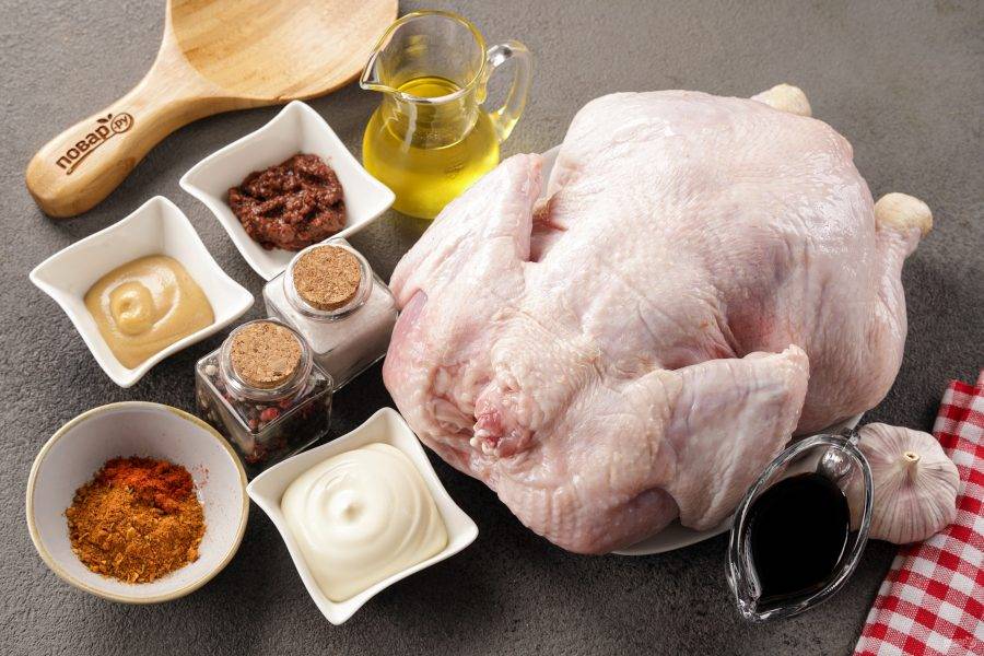 Подготовьте все ингредиенты по списку. У меня аэрогриль с чашей на 6,5 литров, в неё поместится курица до двух килограммов. Я взяла целую тушку весом 1,5 кг. Если чаша вашего аэрогриля 3-4 литра, то вам нужно взять курицу весом не более 1,2 кг.