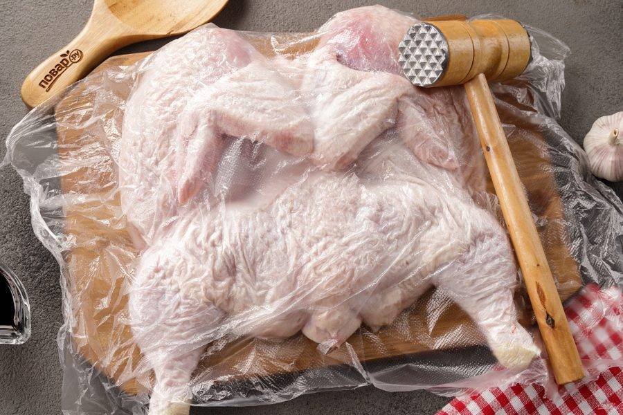 Накройте курицу пищевой плёнкой или пакетом и слегка отбейте кухонным молоточком с двух сторон.