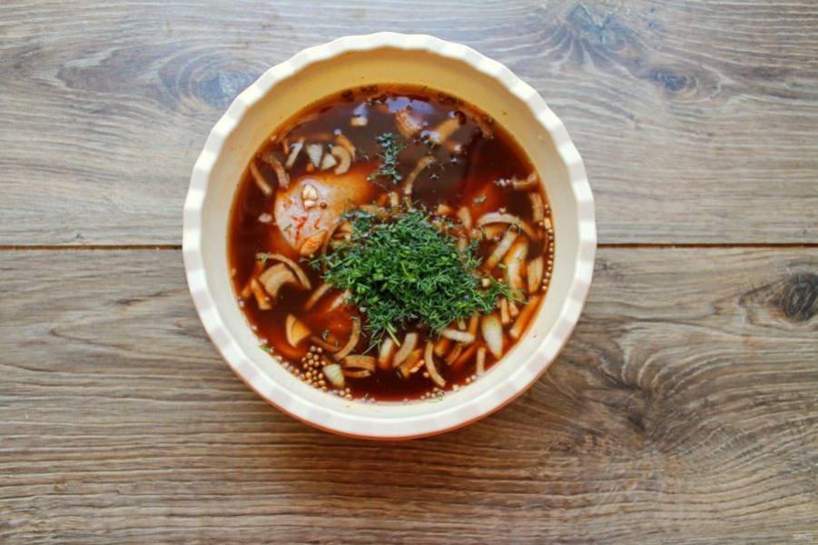 Заварку процедите и влейте в миску с курицей и маринадом.
