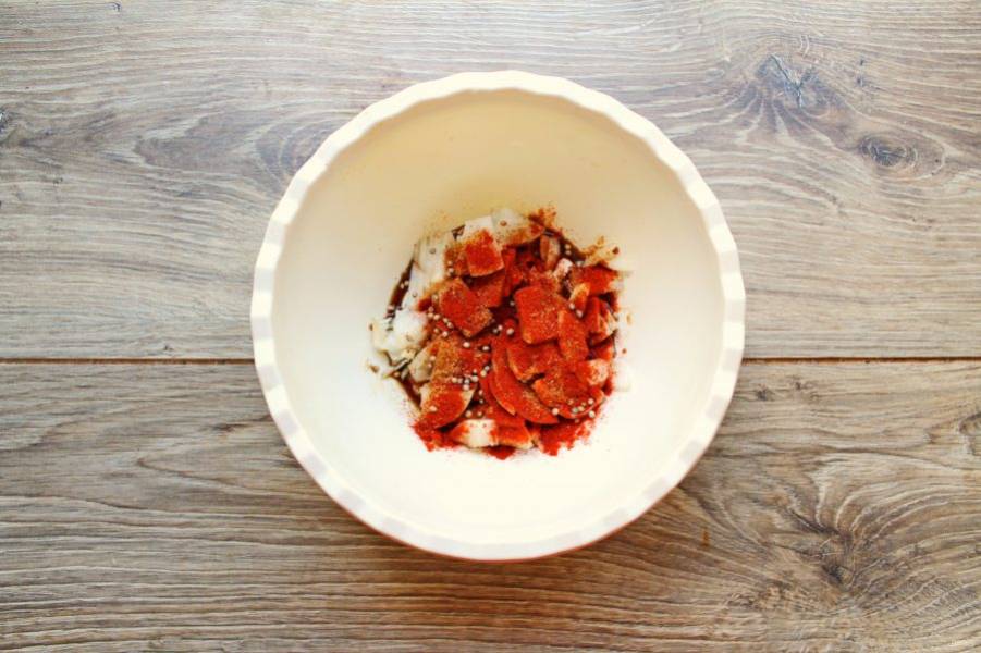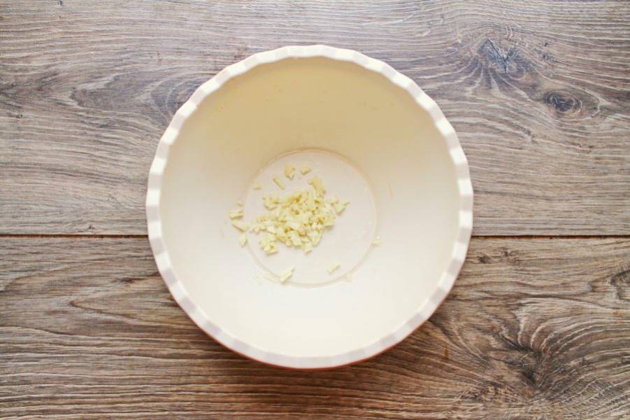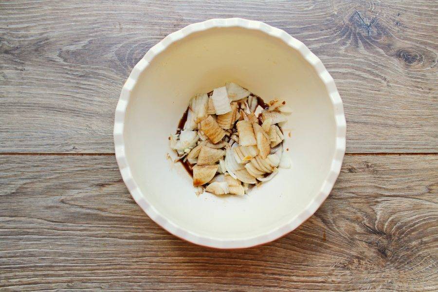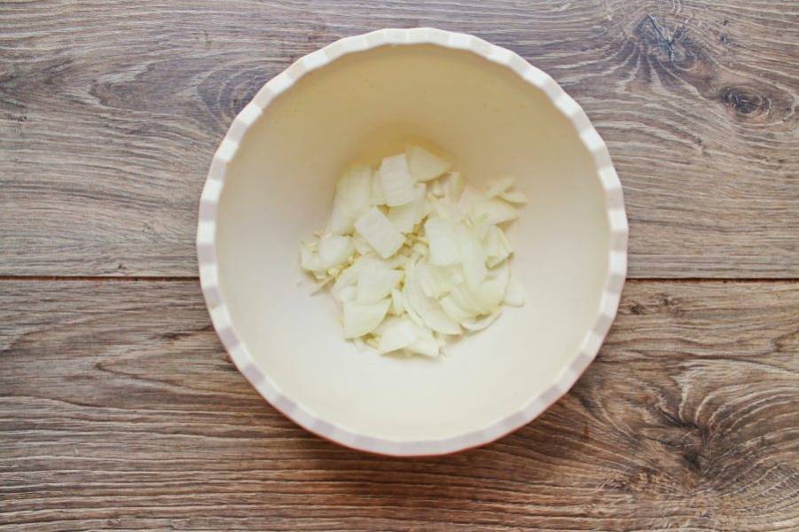 Репчатый лук очистите и порежьте, добавьте к чесноку.