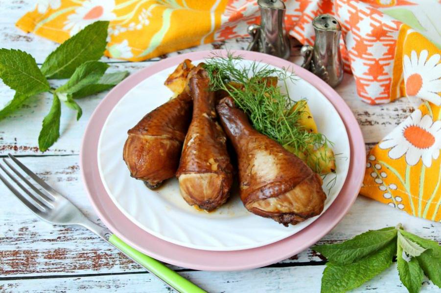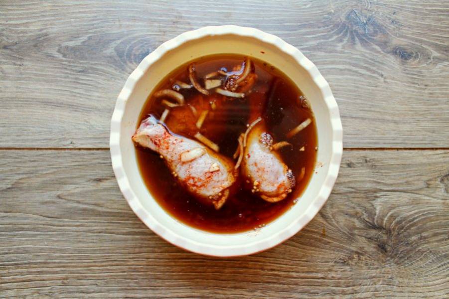 Подготовьте все необходимые ингредиенты для приготовления курицы в чайном маринаде. Курицу, у меня голени, сполосните и обсушите. Воду доведите до кипения и заварите чай, накройте крышкой, оставьте на 20 минут настаиваться.