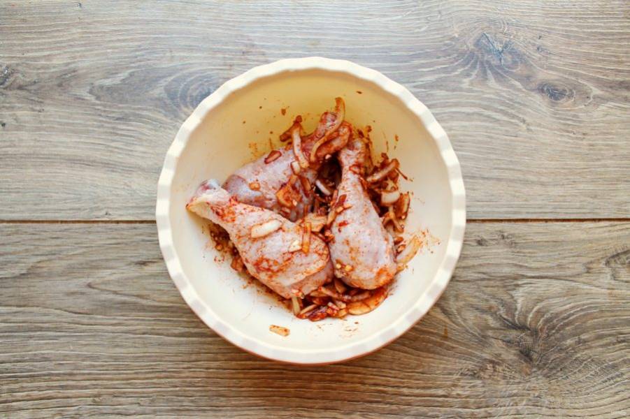 Переложите курицу с чайным маринадом в чашу мультиварки.