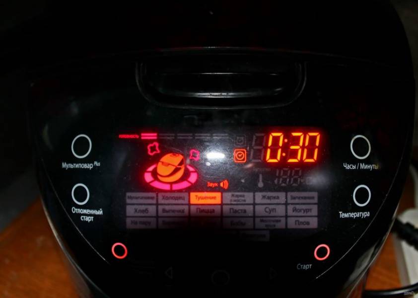 Включите мультиварку в режим "Тушение" и выставите время на 30 минут.