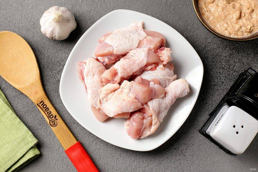 Курицу промойте, обсушите и нарежьте порционными кусочками.