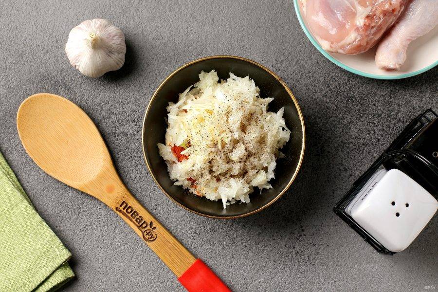 Добавьте тёртый на крупной тёрке лук, давленый чеснок, соль и перец по вкусу.