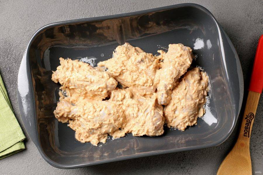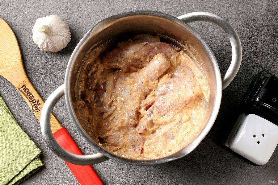 Соедините курицу и маринад. Перемешайте и оставьте по возможности хотя бы на пару часов.