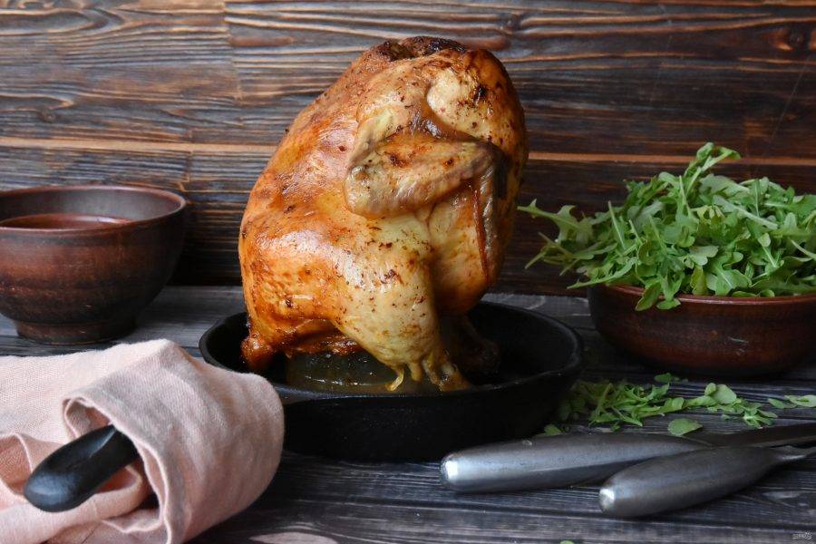 Перенесите курицу вместе с поддоном в духовку. Запекайте при температуре 180 градусов 50-60 минут. Для равномерного подрумянивайся и избежания подсушивания мяса поливайте птицу, вытопившемся в поддон жиром.
