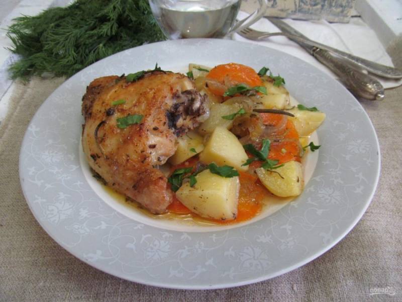 Куриный окорочок разделите на бедро и ножку, смажьте оставшимся маслом и специями.