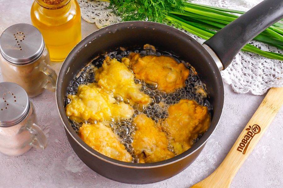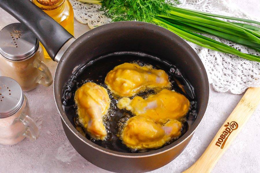 В небольшой емкости разогрейте растительное масло. Выложите в кляр части курицы и обпанируйте со всех сторон.