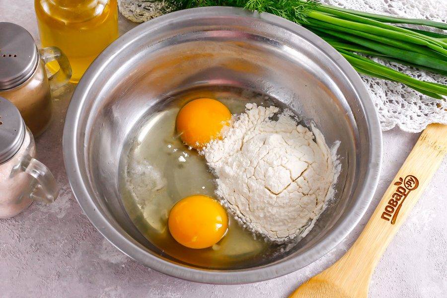 В глубокой емкости взбейте куриные яйца с солью и пшеничную муку.