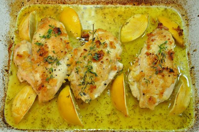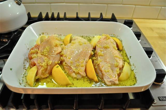 Уложите в форму куски грудки, посолите и хорошо обмакните в винном соусе. Положите лимоны и сверху полейте маслом с чесноком.
