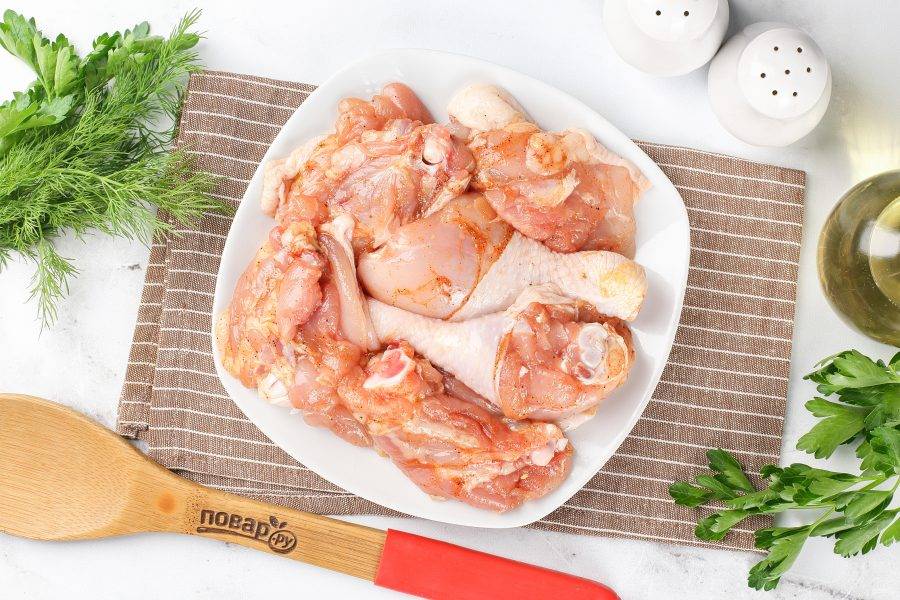 Разрежьте курицу на части, натрите солью и любимыми специями.