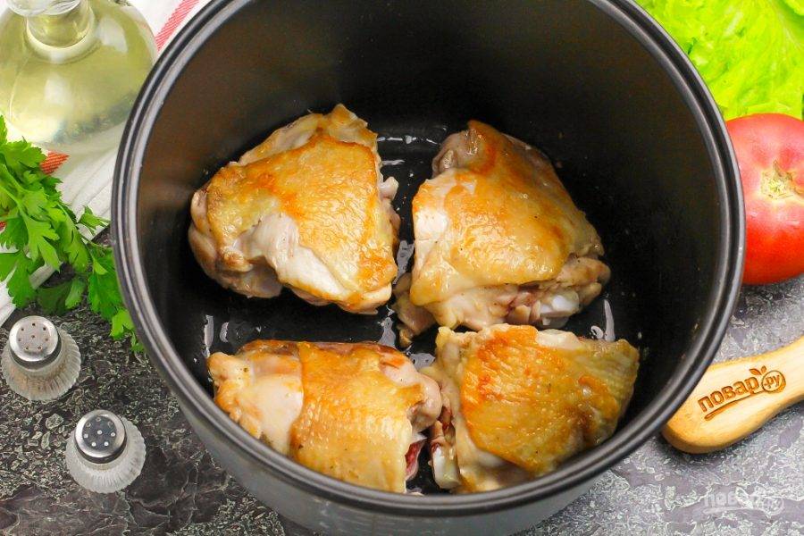 Влейте растительное масло в чашу мультиварки и активируйте режим "Жарка" на 15 минут. Прогрейте масло примерно минуту и выложите бедра кожей вниз. Если масло не прогреть, то кожа "приклеится" ко дну чаши.