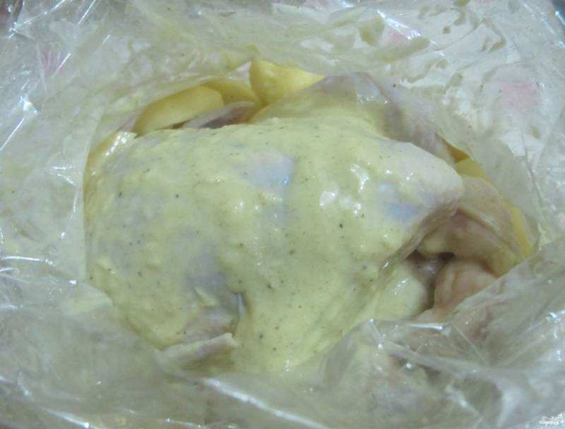 Теперь подготовим курицу. Я буду готовить ее целиком, но можно делать подобным образом и различные части: например, ножки или крылышки. Обмазываю курицу сметанной смесью со всех сторон и изнутри в том числе. Кладу её в пакет для запекания и оставляю мариноваться на час.