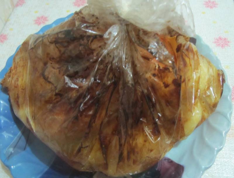 Через полчаса после того как поставили курицу в духовку, проверяем, насколько раздулся пакет. Скорей всего вам нужно будет сделать в нем небольшие отверстия или прорезь сверху, чтобы выходил воздух. Печем еще с полчаса. Затем достаем и осторожно приоткрываем верх пакета. Это нужно, чтобы на курочке появилась аппетитная корочка.