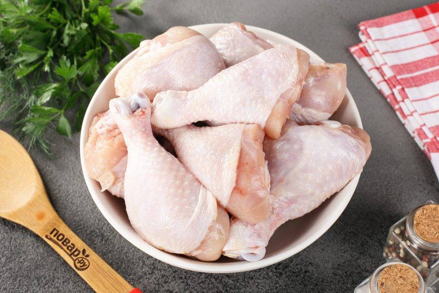 Курицу если необходимо порубите на части, промойте и обсушите. Я буду готовить голени.