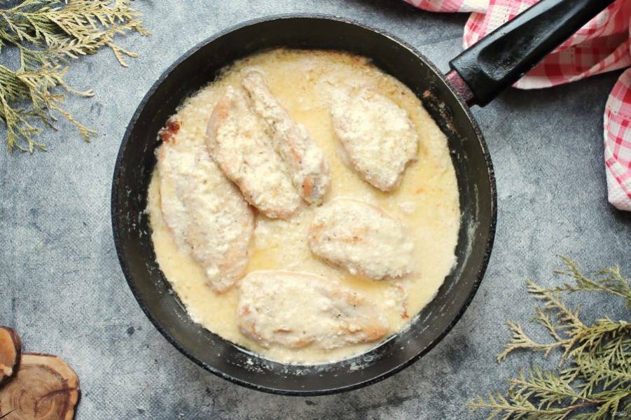 Сыр, у меня моцарелла, натрите на крупной терке и смешайте со сливками. Все посолите и залейте обжаренное филе.