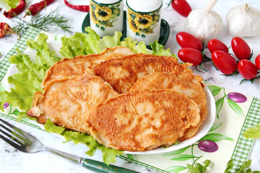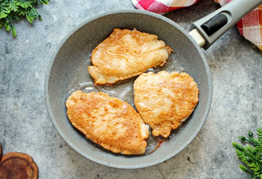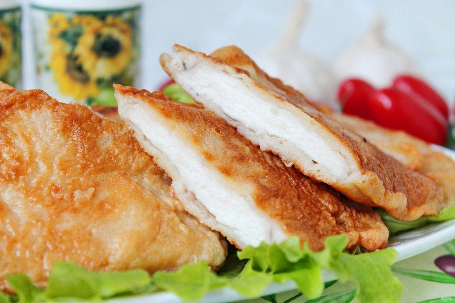 В сковороду налейте растительное масло и разогрейте на среднем огне. Выложите курицу в тесте и обжаривайте на медленном огне с двух сторон до готовности и золотистой корочки. У готовой курицы на поверхности появляются пузырьки масла.