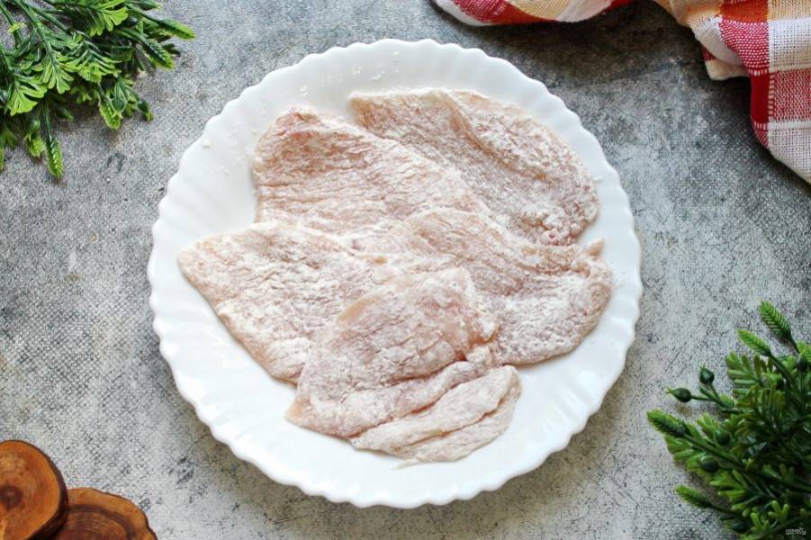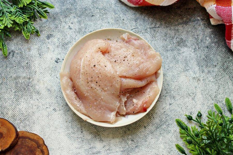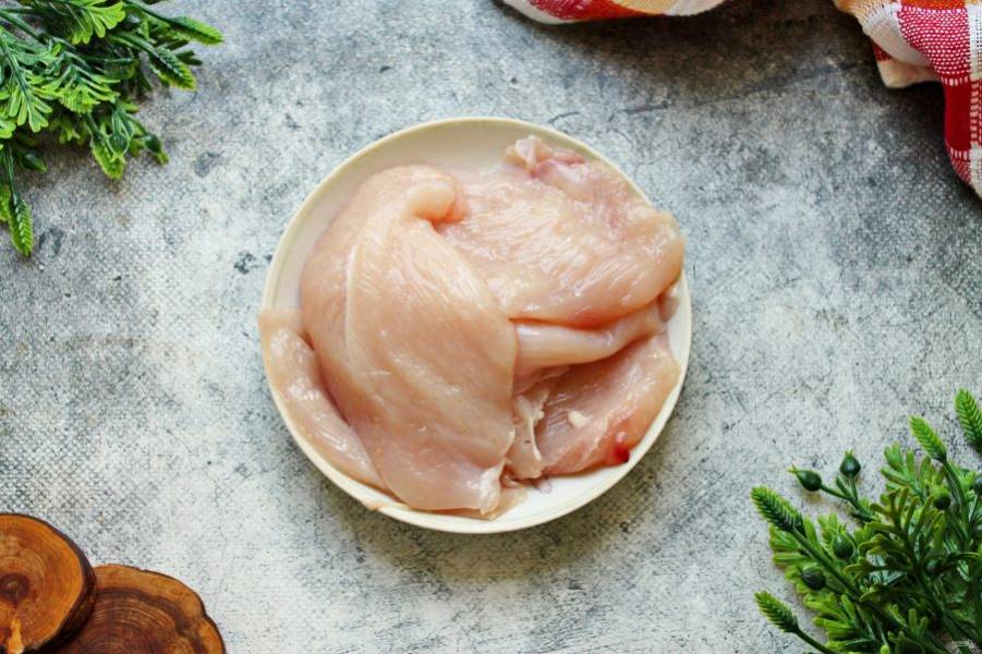 Куриную грудку сполосните, обсушите и разрежьте вдоль на пластинки толщиной 0.7-1 сантиметр.