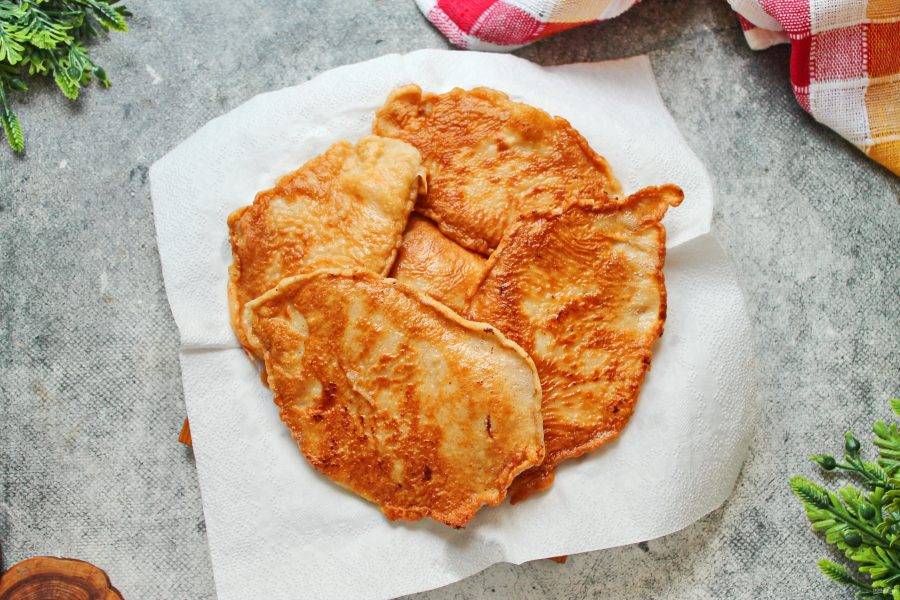 Переложите готовую курицу на бумажные салфетки, чтобы убрать лишнее масло. Обжарьте так всю курицу.