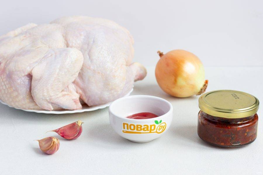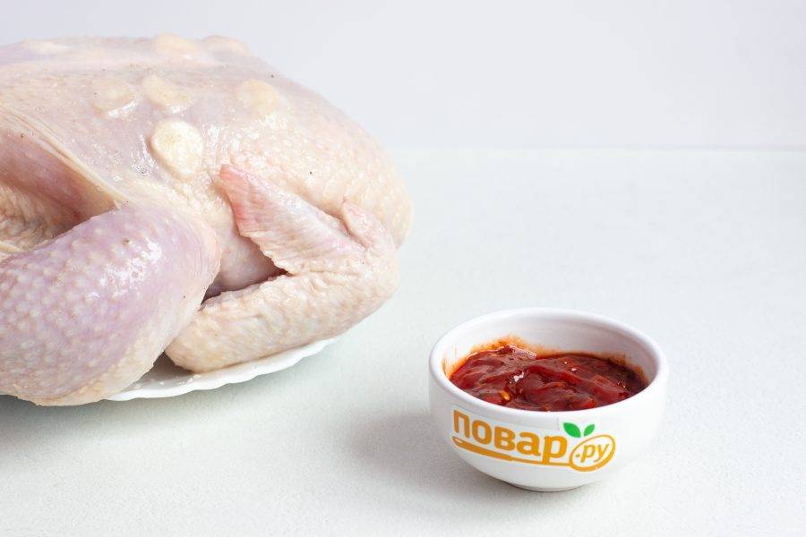Для маринада смешайте кетчуп и аджику. Кусочками чеснока нашпигуйте курицу на грудке под кожей. Натрите всю курицу солью.