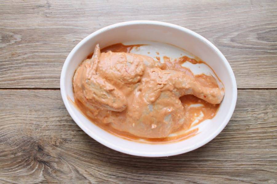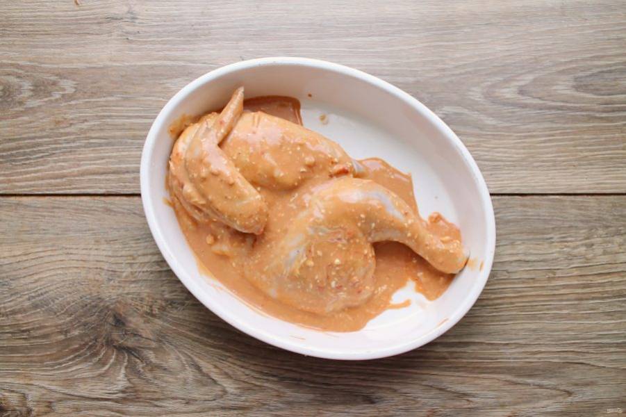 Курицу сполосните и обсушите. Форму для запекания смажьте растительным маслом и выложите курицу, посолите и поперчите. Смажьте ее полностью приготовленным маринадом и оставьте на один час.