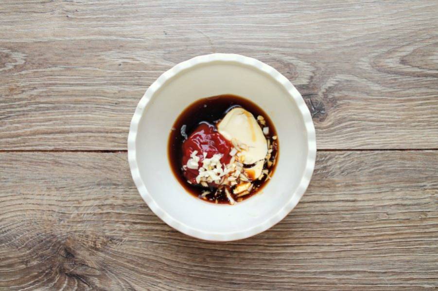 Смешайте в миске соевый соус, майонез, кетчуп и измельченный чеснок.