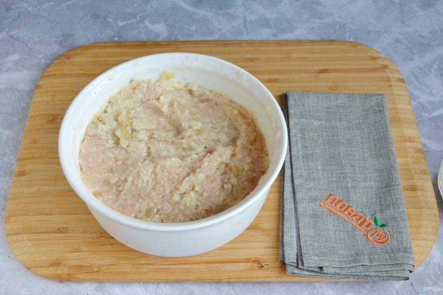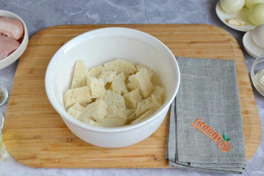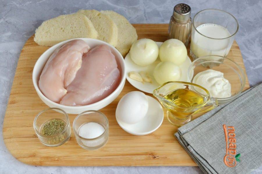 Подготовьте продукты. Вымойте куриное филе, с хлеба срежьте корочки, очистите лук и чеснок. Приступим! Куриное филе перекрутите через мясорубку или сделайте фарш с помощью комбайна.