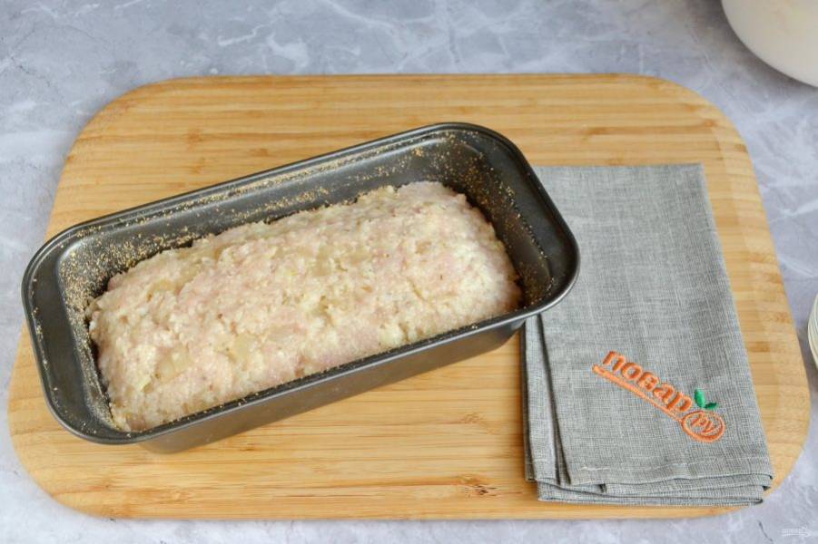 Наполните форму фаршем, распределите равномерно, сделайте красивый верх, формируя буханочку.