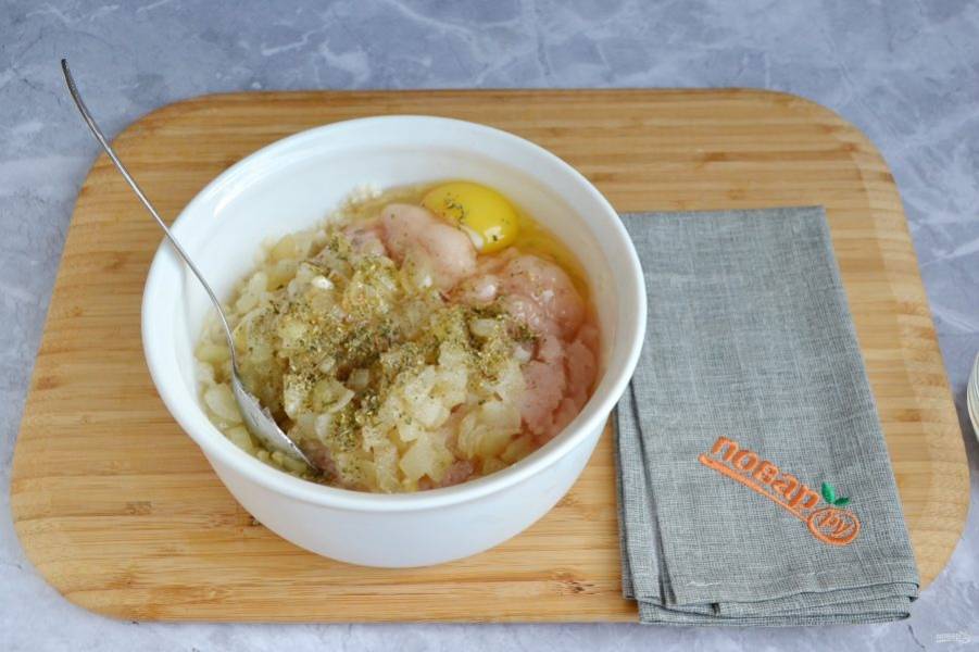 Соедините хлеб с фаршем, яйцом (если яйца мелкие, то добавьте два), жареными овощами, специями, солью.