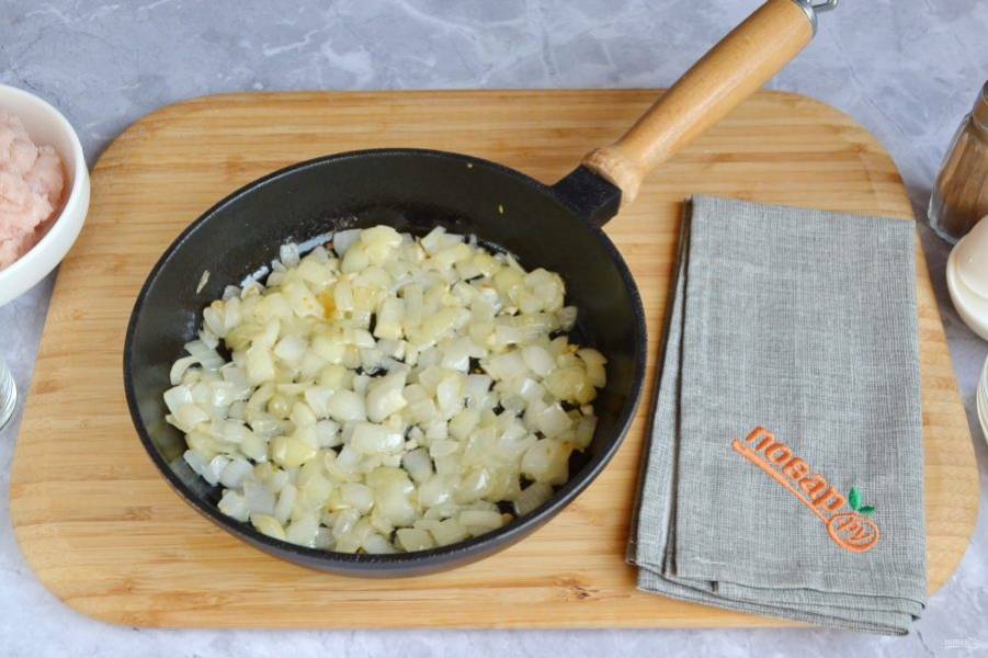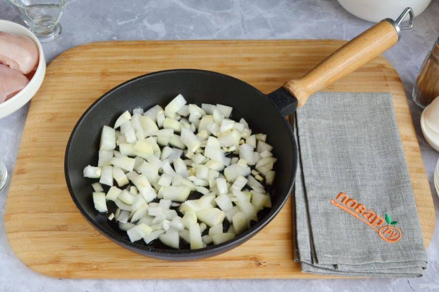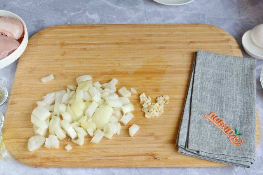 Порежьте кубиками репчатый лук и чеснок.